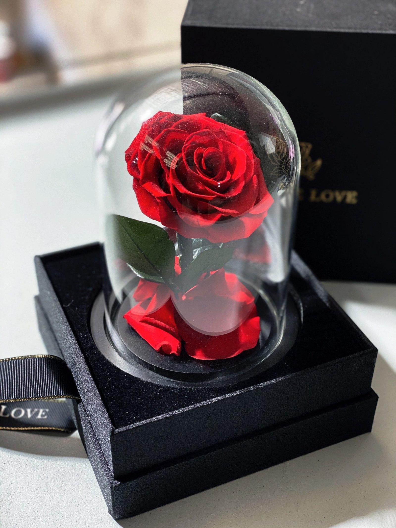 Inspired by a romantic fairytale, Luxe Bouquet’s signature Everlasting Rose is a real rose encapsulated in a luxurious glass dome and preserved to last over a year, with no water required and zero maintenance!